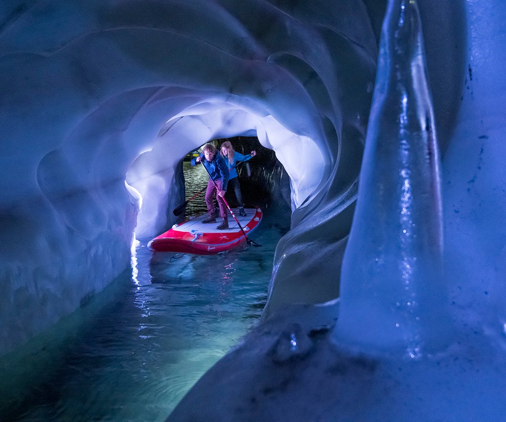 Le glacier de Hintertux dissimule un monde secret, un palais de glace fait de couloirs et de salles. Sur la rivière souterraine du glacier, vous pouvez pagayer et naviguer dans un petit bateau. Une expérience unique.
