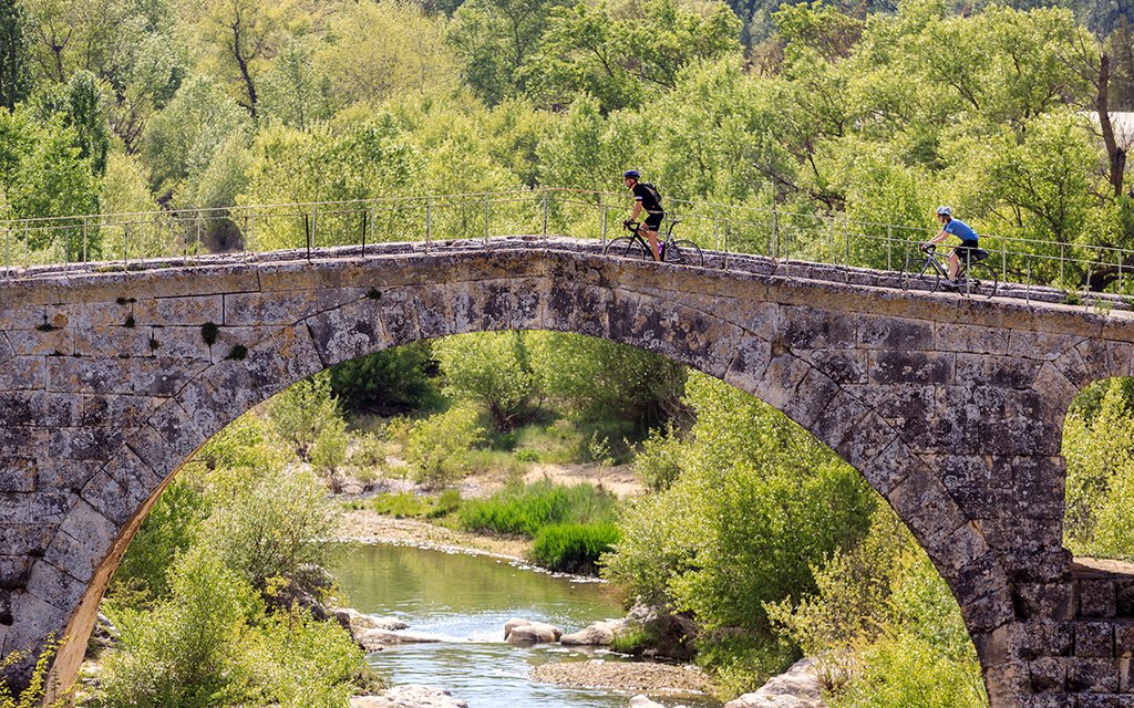 En chemin, vous passez par des villages comme Reillane et Lincel, qui semblent avoir été jetés à flanc de colline, en empruntant des routes qui serpentent à travers bois et passent devant des champs de lavande. Tout au long du parcours, l'ambiance est totalement provençale. Notamment au marché d'Apt, où vous pouvez acheter des tomates rouge vif et du jambon du Ventoux. Il suffit ensuite de vous mettre à l'ombre d'un saule pour le pique-nique ! Vous aurez alors déjà dépassé le clou du parcours : le Pont Julien relie les deux rives du Cavalon depuis 2 000 ans.