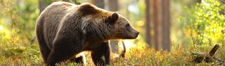 Contrairement à ce que l'on pourrait penser, l'ours brun est un omnivore. Il se nourrit principalement d'aliments d'origine végétale, mais sa puissance lui permet naturellement aussi de s'attaquer à des animaux tels que des moutons ou des élans. L'ours brun peut mesurer entre 1,70 m et 2,80 m de haut et ses puissantes pattes avant se terminent par de longues griffes.