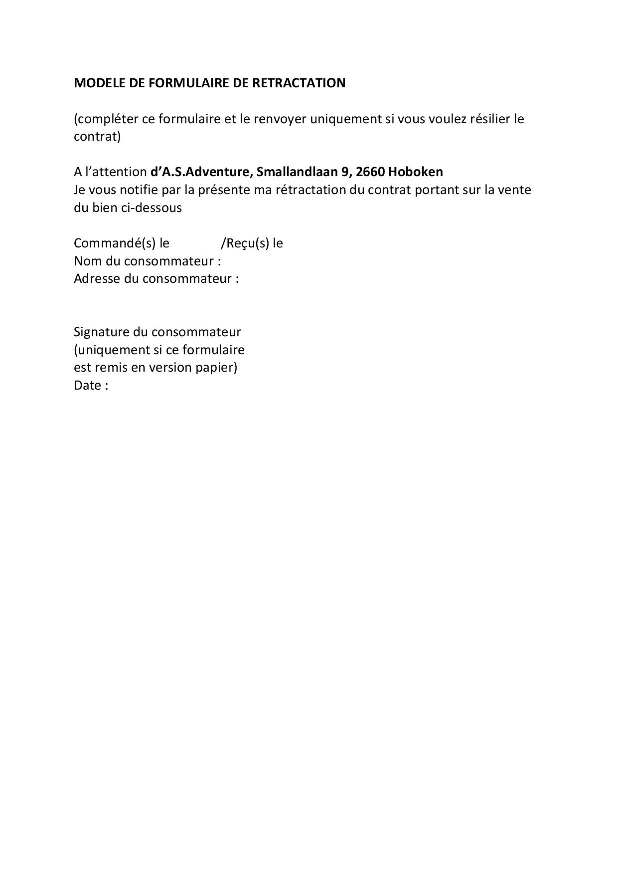 Pour exercer le droit de rétractation, vous devez nous notifier Retail concepts N.V., Smallandlaan 9, 2660 Hoboken, 0032(0)3/828.30.15, un courriel électronique votre décision de rétractation du présent contrat au moyen d’une déclaration dénuée d’ambiguïté (par exemple, lettre envoyée par la poste, télécopie ou courrier électronique).